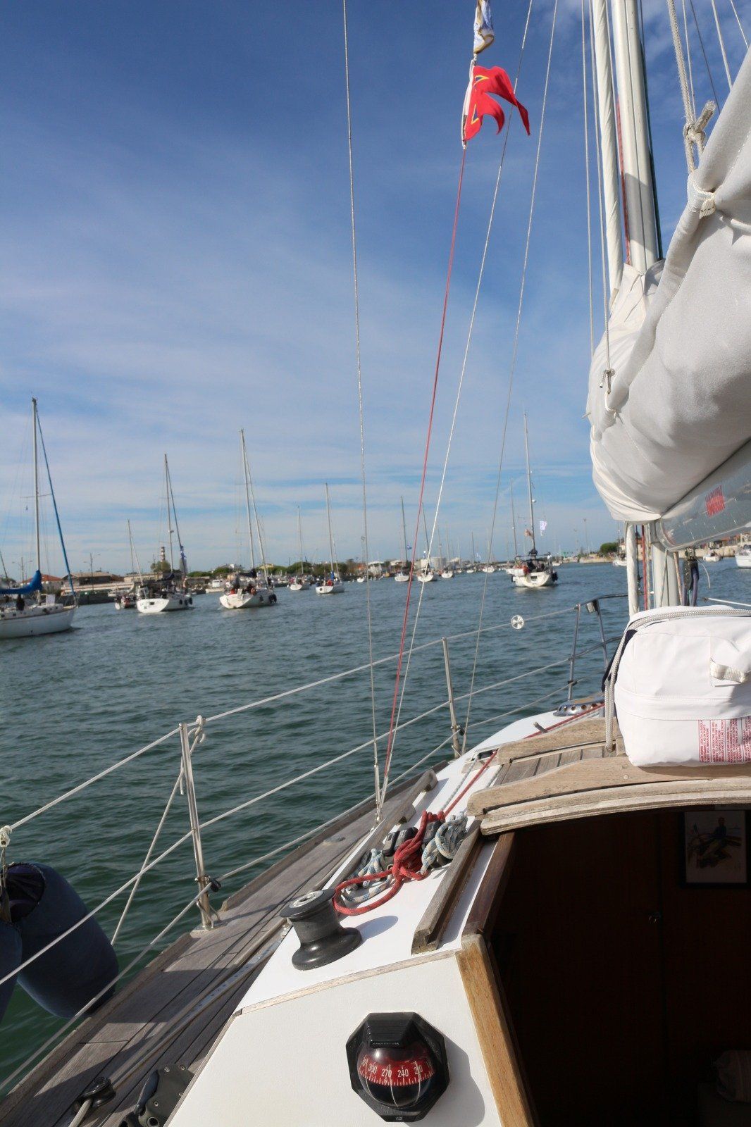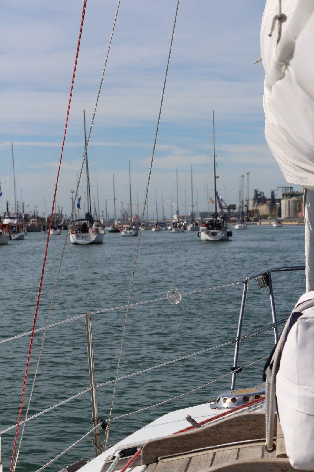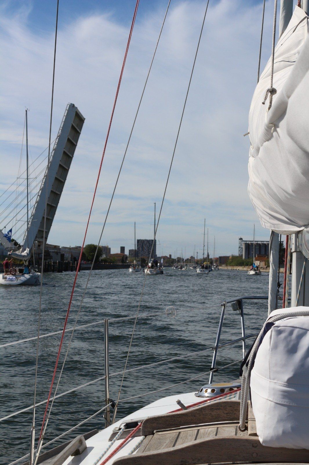 Navigare in Sicurezza Per Ravenna con quasi 123 barche iscritte, a vela ma anche a motore dai 5 ai 50 piedi. La flotta è partita alle 10.30 dall'avamporto, per rispettare il traffico commerciale, ed ha risalito a 5nodi di media il lungo Canale Corsini sulle cui rive si estendono le installazioni industriali, per arrivare all'apertura del ponte mobile alle 11.45.